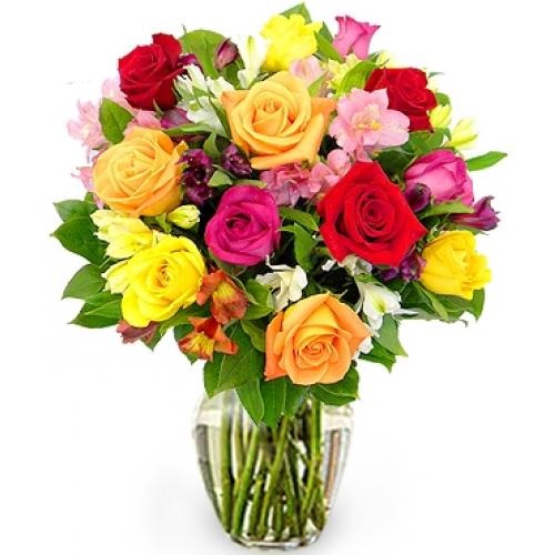 [材料]:精品各色玫瑰12枝,時令花材搭配,精美玻璃花瓶包裝!