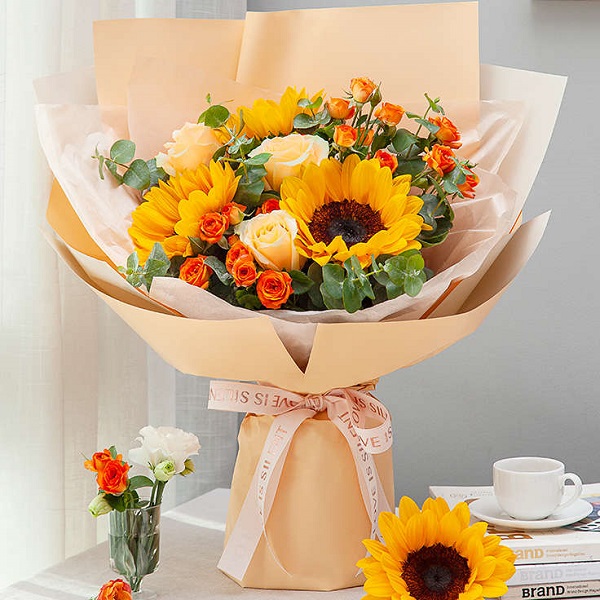 材料:香檳玫瑰3枝、向日葵3枝、橙色多頭玫瑰2枝、尤加利葉5枝